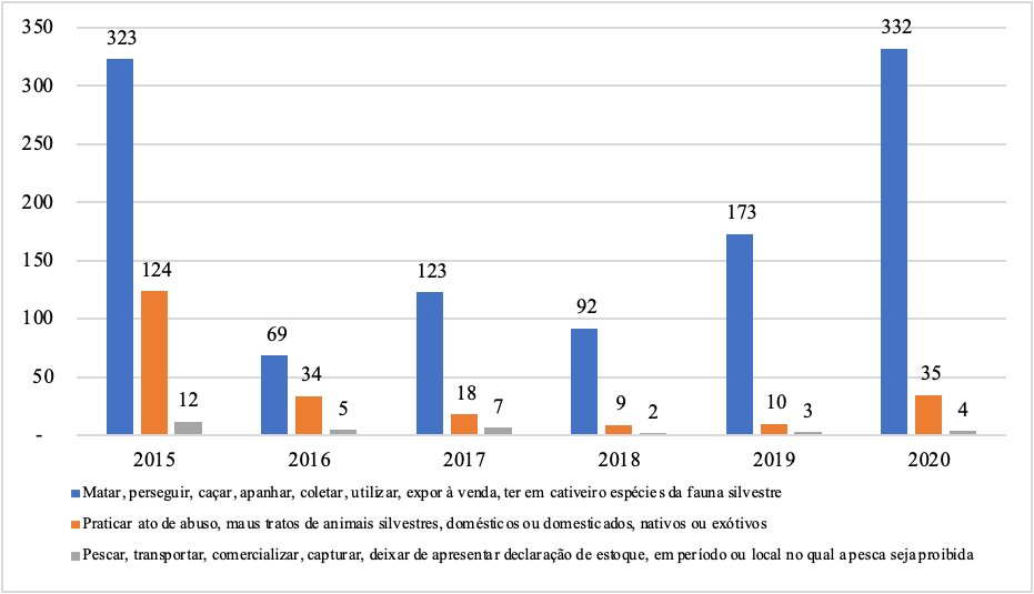 Os crimes contra a fauna que mais se destacam são matar, perseguir, caçar, apanhar, coletar, utilizar, expor à venda e ter em cativeiro espécimes da fauna silvestre. Em especial, destacam-se os anos de 2015 e 2020, com número de ocorrências superior a 300 casos atendidos pelo BPAmb. Entretanto, analisa-se que em 2016 ocorreram em torno de 70 ocorrências desses mesmos crimes (Gráfico 4).