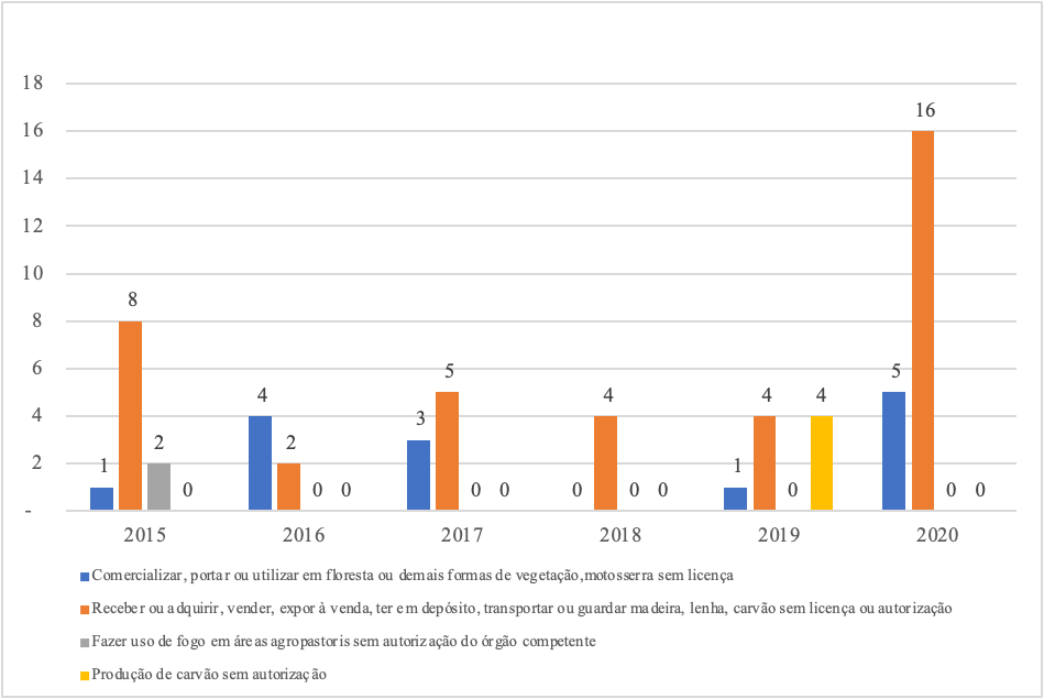 Como pode ser observado, dos crimes contra a flora, destacam-se os relacionados à exploração de madeira, sendo o maior número de ocorrências em 2020. Ademais, fazer uso de fogo em áreas agropastoris sem autorização do órgão competente foram apenas 2 casos nos anos de 2015 e 2017, respectivamente. A produção de carvão sem autorização soma 4 ocorrências concentradas em 2019 (Gráfico 6).