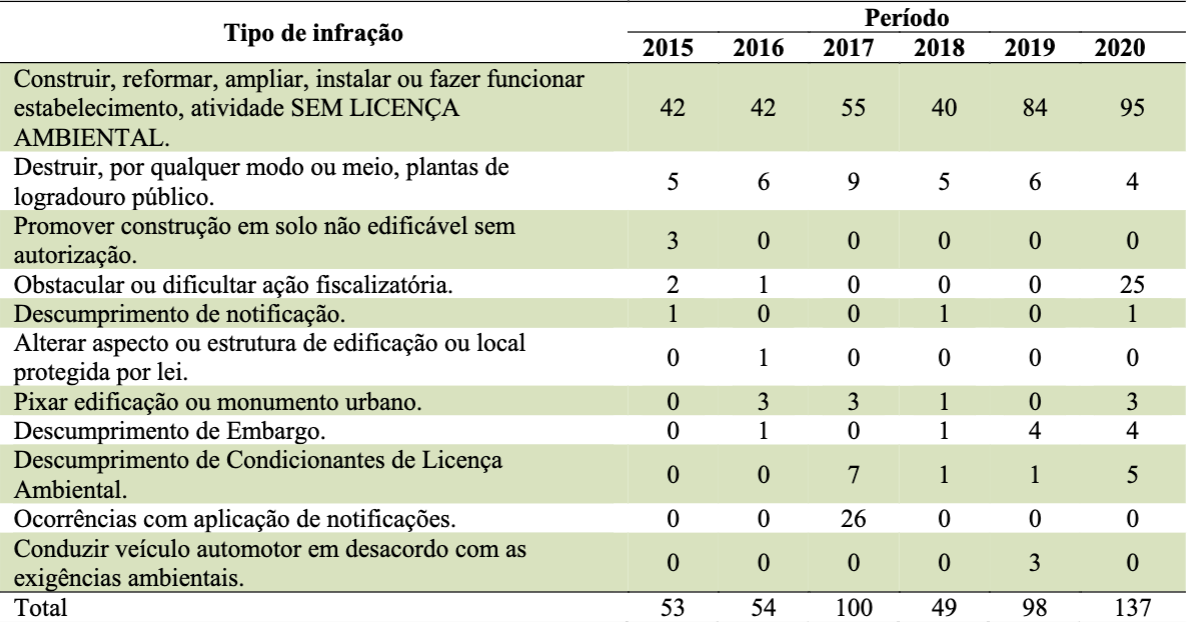 Em relação ao número de infrações contra o ordenamento urbano fiscalizadas pelo BPAmb, observa-se que infrações do tipo construir, reformar, ampliar, instalar ou fazer funcionar estabelecimento e atividade sem licença ambiental são os casos que mais se destacam, desta forma, apresentam os maiores números em todo o período avaliado, com variações de 40 a 95 casos. Ademais, vale ressaltar que somando todos os tipos de infrações, os anos de 2017, 2019 e 2020 tiveram maior destaque com 100, 98 e 137 casos, respectivamente (Tabela 1).