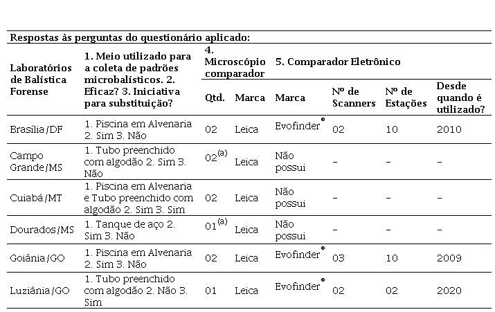 Segundo o levantamento realizado, todos os laboratórios de Balística Forense da região Centro-Oeste contam com um ou dois microscópios comparadores da marca Leica, mas apenas a Polícia Civil do Distrito Federal e a Superintendência de Polícia Técnico-Científica de Goiás utilizam comparadores eletrônicos.