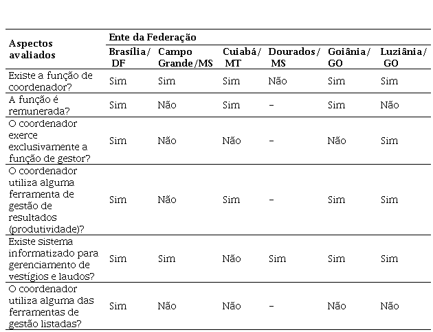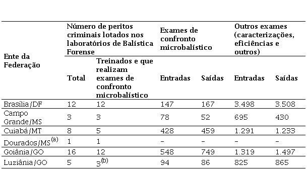 Por meio deste trabalho, é possível entender e descrever a realidade dos seis laboratórios de Balística Forense do Centro-Oeste que realizam exames periciais de confronto microbalístico, principalmente quanto às suas estruturas físicas, demandas, disponibilidades de recursos materiais e humanos, além dos aspectos relacionados à gestão.