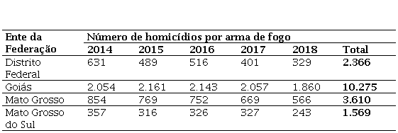 Conforme mostrado na Tabela 3, o ente federativo do Centro-Oeste com menor número de homicídios (Mato Grosso do Sul) entre 2014 e 2018 é também o que apresenta o menor número de solicitações de exames periciais de confronto microbalístico. Já o estado de Goiás, com o maior número de homicídios por armas de fogo entre os anos de 2014 a 2018, é o que apresenta a maior demanda para esse tipo de exame.
