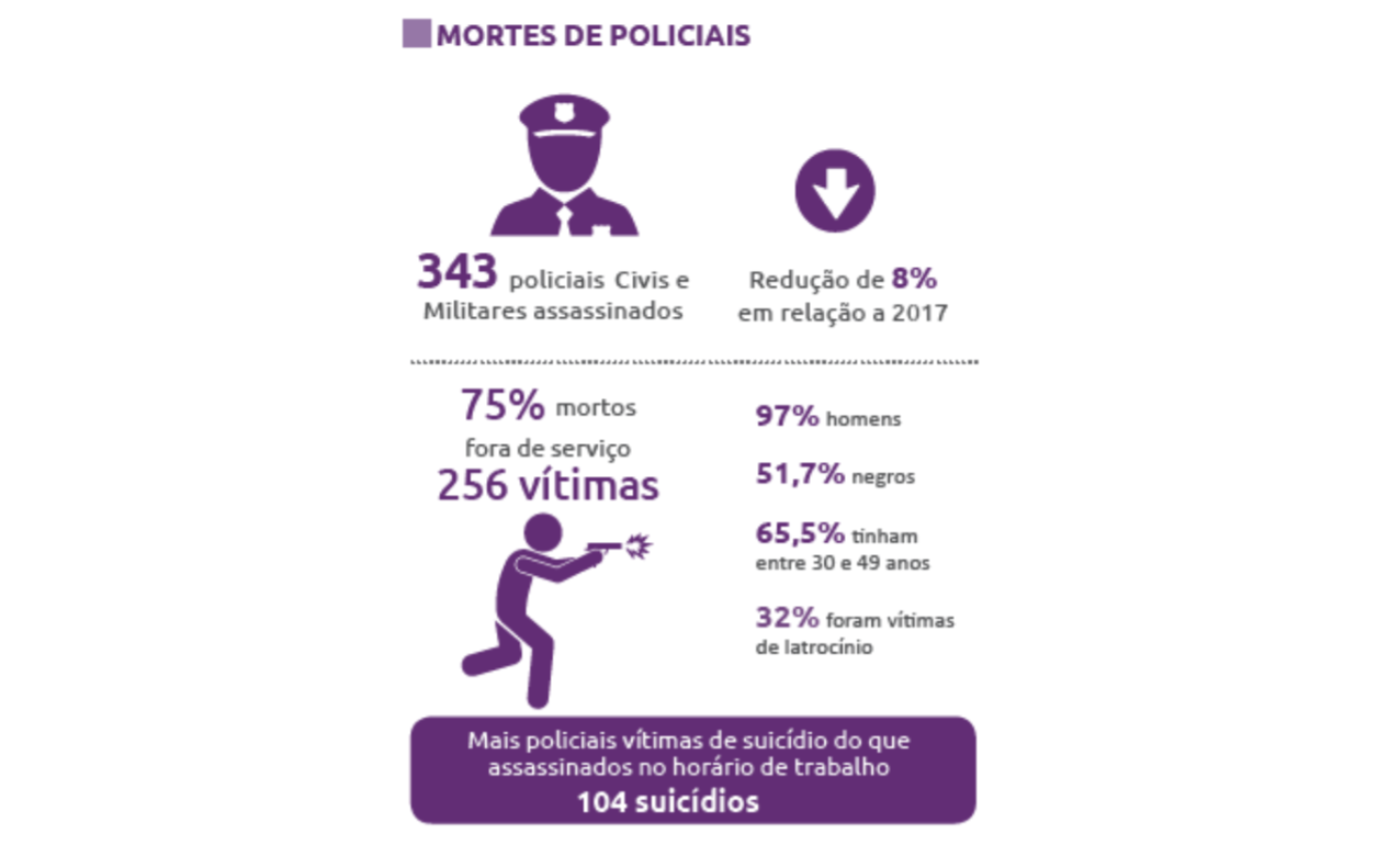 Estudo de Miranda e Guimarães (2016) indica que a proporção de suicídio é quatro vezes maior entre policiais do que na população em geral. No ano de 2019, a taxa de suicídio entre esses profissionais, registrada pelo Fórum Brasileiro de Segurança Pública (2020), ainda era significativamente maior do que na população em geral, de forma que naquele ano morreram mais policiais por suicídio do que em confronto em serviço. Estes dados apontam para um tipo de trabalho (e de trabalhadores) mais vulnerável para questões ligadas ao sofrimento psíquico agudo e grave, com consequências devastadoras. A alta taxa de suicídio da categoria não é aleatória, mas sim “o retrato de uma realidade perversa mantida por políticas públicas de segurança que tratam seus agentes principais como torniquetes de um sistema falido” (FBSP, 2019, p. 49).