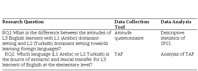 A mixed research approach was used in the current study to investigate attitudes and origins of syntactic and lexical transition of L1 Arabic L2 Turkish L3 to English language learners at the Uludağ University School of Foreign Languages. In order to gain accurate information about the central phenomenon, a hybrid (quantitative and qualitative) approach was found to be beneficial, which was difficult to find by more traditional research methods (Strauss & Corbin, 1998). This research incorporated a case study method to "see the case from the inside out" and to see the core phenomenon from the point of view of English L3 learners (Gillham, 2000, p.11). An attitude questionnaire (Appendix A) was implemented to get the quantitative data concerning the behavioral, cognitive, and emotional aspects of the attitude of the learners towards foreign language learning. This research tool was adopted from Eshghinejad (2016). This attitude questionnaire was constituted by the researcher in the light of the Attitude Questionnaire Test employed by Boonrangsri et al. (2004 as cited in Eshghinejad, 2016), the Attitude and Motivation Test Battery (AMTB) designed by Gardner (1985), and a Behavioral, Cognitive, Emotional Attitude (BCEA) questionnaire. The questionnaire consisted of 30 individual items. A five-point Likert scale from Level 1: Strongly Disagree to Level 5: Strongly Agree was used. At the end of the questionnaire, the participants were asked an optional open- ended question about the effective factors on their attitudes towards learning a foreign language. In addition to the attitude questionnaire, Think Aloud Protocols (TAPs) was administered in order to make the cognitive process observable. In the processes of language learning, whether L1 or L2, it is not possible to observe the cognitive and individual processes; with this in mind, the present study tried to make it as straightforward as possible what the students think while they are writing in L3, and more specifically which language is the source of syntactic and lexical transfer. To this end, the data were collected through the think-aloud protocols (TAPs or concurrent verbalizations) as the main verbalization methods (Ericsson & Simon, 1993).
