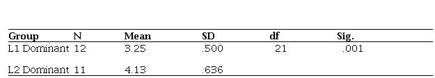 For the first research question, an attitude questionnaire was applied to the participants, and the results of the questionnaire were analyzed according to the group variables (L1 dominant or L2 dominant learners) were analyzed via SPSS and the relation between the group dynamics and attitudes of the learners was compared.
