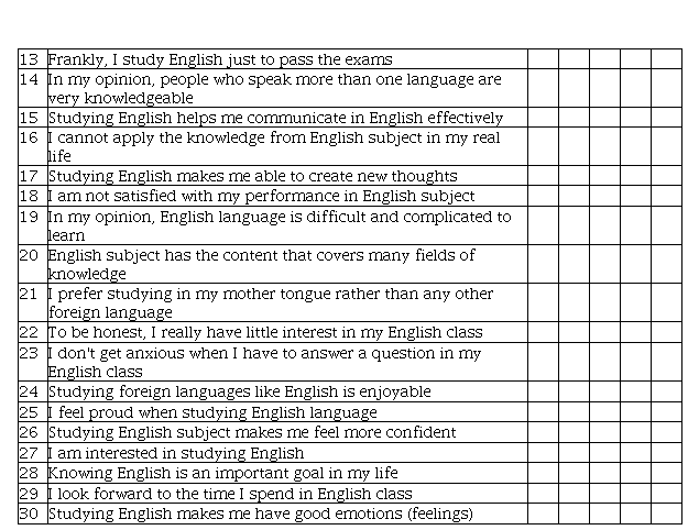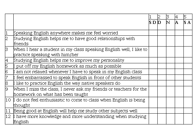The following items ask about your attitudes toward learning the English language. Remember, there are no right or wrong answers; answer as accurately as possible. Please read the statements below carefully and tick the appropriate choices that reflect your attitudes toward the English language. Use the scale below to answer the questionnaire items: 1 = Strongly Disagree, 2=Disagree, 3 = Neutral, 4 = Agree, 5 = Strongly Agree.