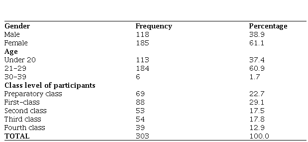 The study was conducted on the students of the English Language Teaching Department at a state university in Turkey. The participants of the study were undergraduate students in the preparatory, first, second, third- and fourth-year classes. There were 583 students in the department. The number of students who participated in this study was 303. Table 1 below shows the distribution of participants in terms of gender, age, their class level. As seen in the table below, 118 (38.9%) of the participants are male while 185 of them (61.1%). There are 113 students under the age of 20 and their distribution percentage is 37.4%, and 184 students between the ages of 21-29 whose distribution percentage is 60.9%. Six students are between the ages of 30-39 and the distribution percentage of them is 1.7%.