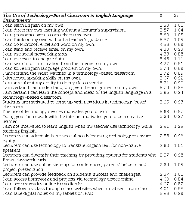 In this study, the opinions of ELT students on the technology-based classroom were investigated. Table 2 shows the results of the survey.