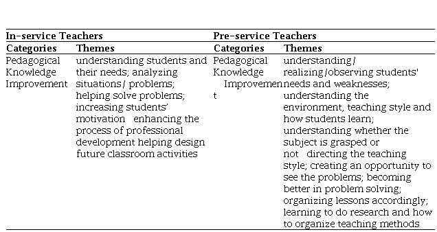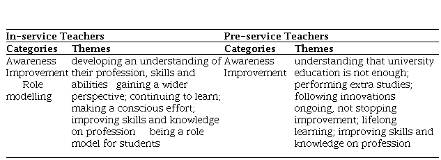 The categories and themes that emerged for both in-service teachers and pre-service teachers about the term professional development can be seen in Table 1. Except for one category, the two categories of awareness and improvement were common for both groups.