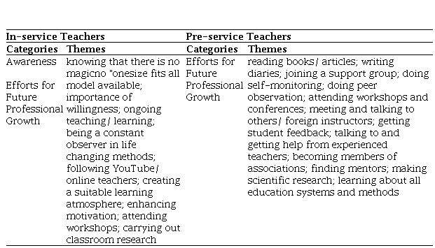To see whether there was a difference between in-service and pre-service EFL teachers’ perceptions about professional development and to see what methods, if any, they were planning to pursue in the future, the data that were collected through the e-mails were scrutinized by content analysis. The findings and the relevant themes are presented as follows: