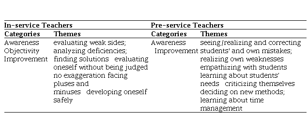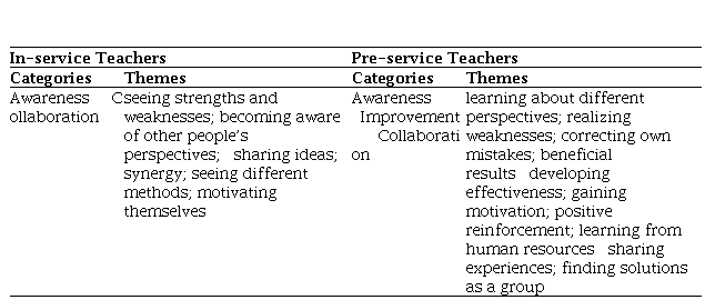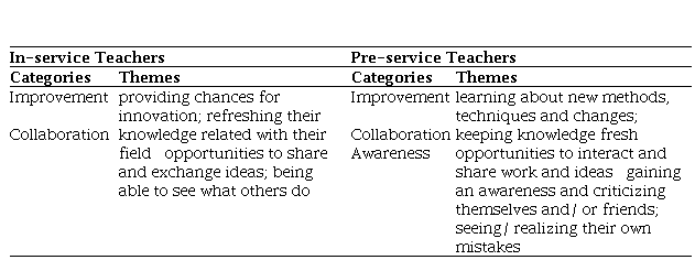 The category of awareness, on the other hand, emerged only for the pre-service teachers, who stated that workshops granted teachers the chance to criticize themselves or other teachers thanks to the learning that took place during the workshops. Workshops also provided teachers the opportunity of seeing their weaknesses, the pre-service teachers thought.