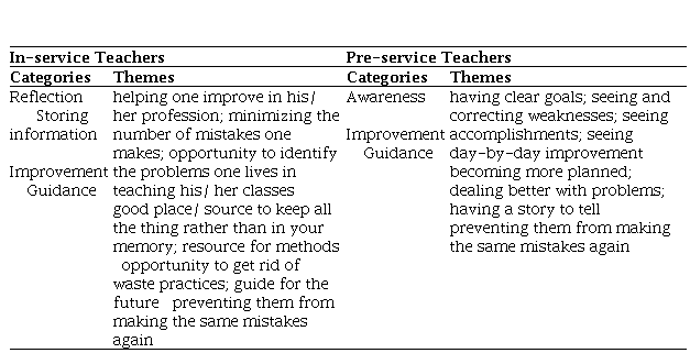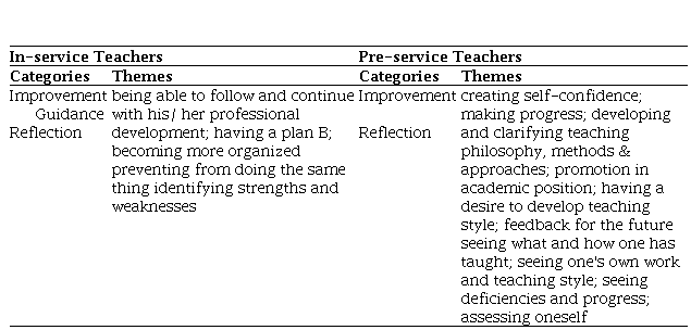 Table 7 shows that the emerging categories for the in-service and the pre-service teachers were slightly different as regards teacher portfolios. The in-service teachers thought of teacher portfolios as a chance to develop and guide themselves along with reminding their strengths and weaknesses. Although two of the in-service teachers mentioned that they have never seen or experienced teacher portfolios before, the remaining four teachers stated that teacher portfolios might give them a chance to review what they have done up to that day, reflect on their experiences and realize their strong and weak sides thanks to the materials/ documents they keep in that portfolio file.