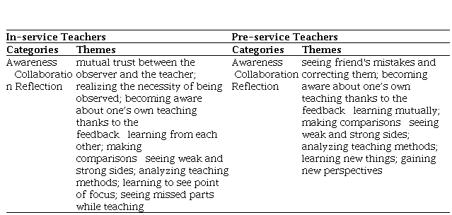 As seen in Table 6, the categories that emerged from the ideas the participants had about the professional development tool of peer observation were the same for both groups. Namely, both the in-service teachers and the pre-service teachers showed signs of awareness, collaboration, and reflection as asides of peer observation. To illustrate, the in-service teachers expressed that they realized the necessity of regular observation and giving and receiving feedback; yet, they also emphasized that trust was an important component in such a professional activity. The inservice teachers also mentioned that they could learn from each other while observing one another, and they could see their strengths and weaknesses along with the parts they skipped while teaching. One in-service teacher expressed his ideas about peer observation as follows: