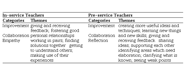 Table 8 shows that both the in-service teachers and the pre-service teachers found peer coaching an effective means of professional development. The categories of improvement and collaboration emerged for both groups, but for the in-service teachers, empathy emerged as the third category. For the pre-service teachers, the last category was reflection.