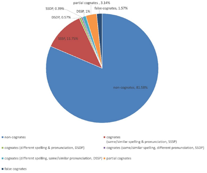 Turkish loanword cognates that were recognized as partial cognates of the English words take 3.14% of the NGSL, namely 88 words. Finally, 44 false cognates were detected, counting for 1.57% of the NGSL. Figure 1 visualizes the proportion of each category. The full lists of words in each category are shown in Appendix 2.
