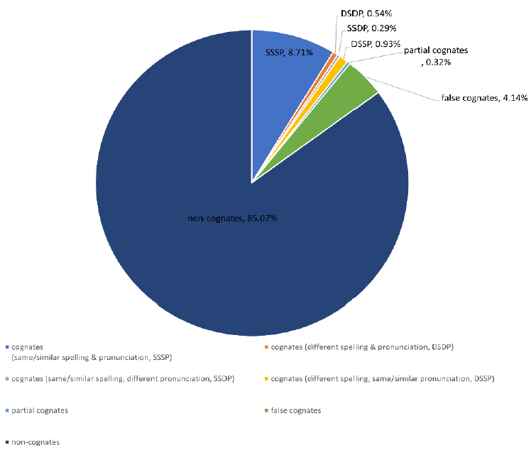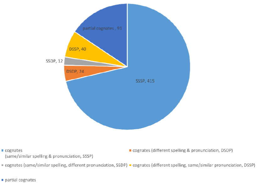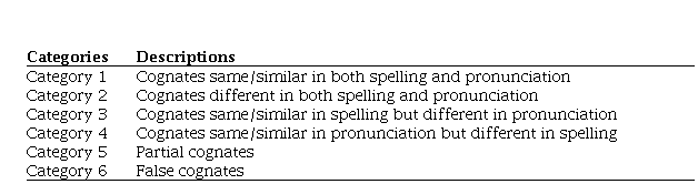 Based on Daulton’s (2008) broader synchronic viewpoint of cognates, cognates can be understood as two words in different languages that share a similar or same form and meaning regardless of etymology. This is different from the strict diachronic view, which emphasizes the common ancestor of the two languages when defining a cognate (Anthony, 1952). Applying the broader synchronic viewpoint in the current study presents the emphasis on pedagogical purposes that put learners’ rather than linguists’ study of cognates into focus. In Rogers et al.’s (2015) study, such a broad definition of cognates was also employed to elaborate the discussion of borrowed words or loanwords across historically unrelated languages. In contrast to cognates, false cognates refer to words that are only similar in form but have different meanings in two languages.