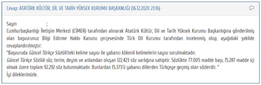 the Atatürk Supreme Council for Culture, Language and History, was examined by the Turkish Language Association within the framework of the Right to Information Law and was answered as follows: