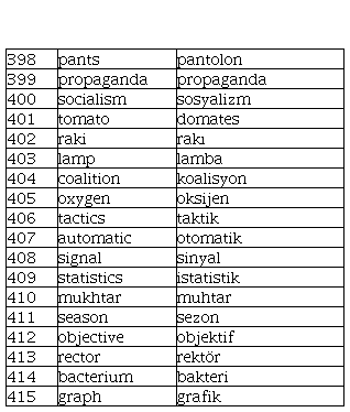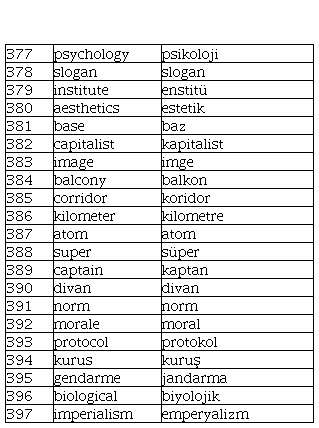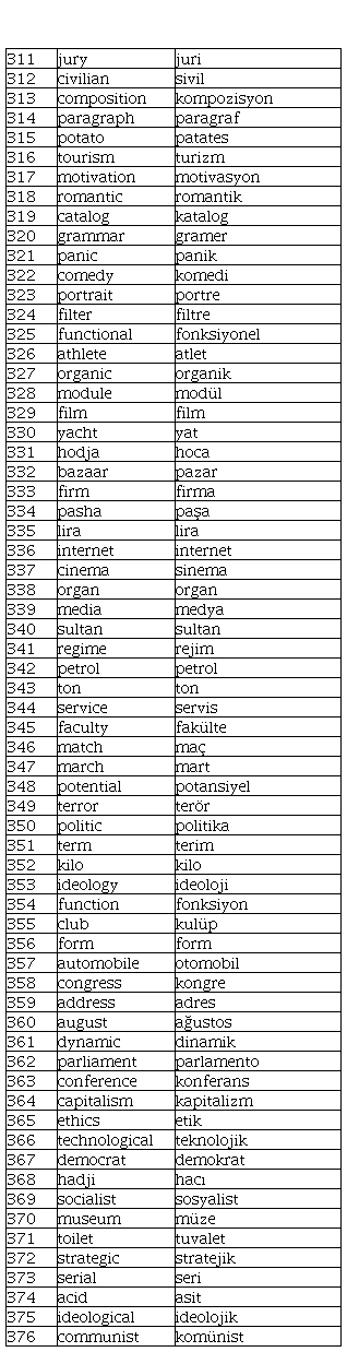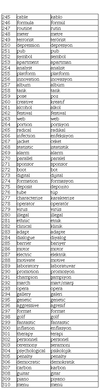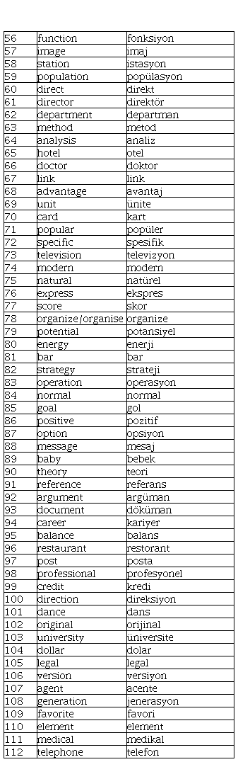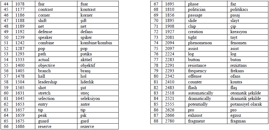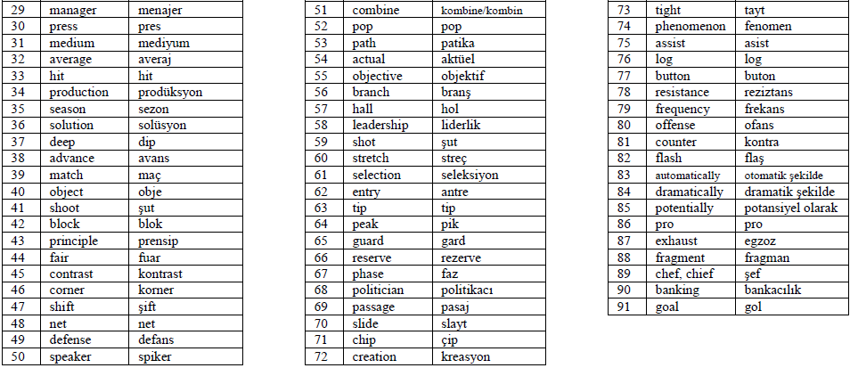 Criterion 1. In terms of orthography, when the corresponding English and Turkish words contain 50% or more same letters in spelling, the two words were categorized as same or similar spelling, e.g., report and rapor, group and grup, information and enformasyon. In contrast, when the two words contain less than 50% same letters in spelling, the two words were categorized as different spelling, e.g., quality and kalite, chance and şans, club and kulüp.