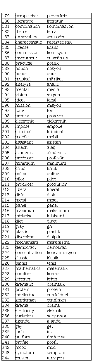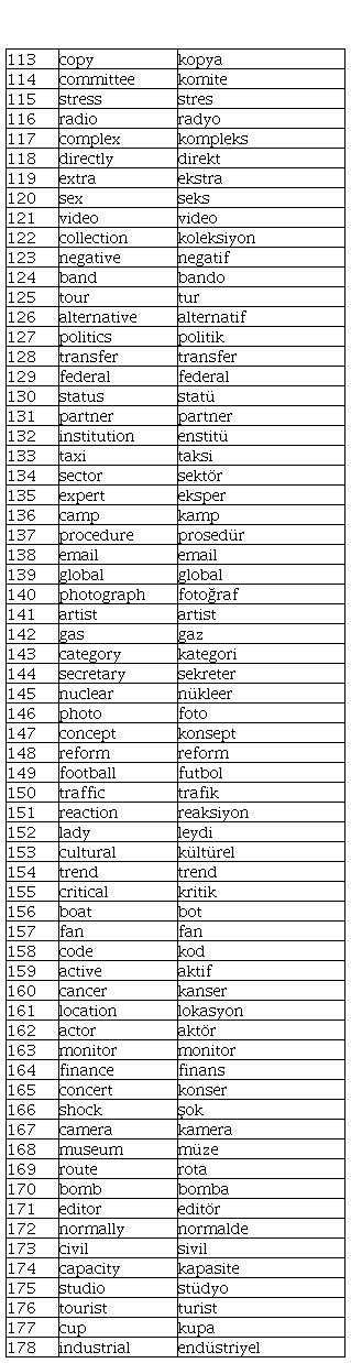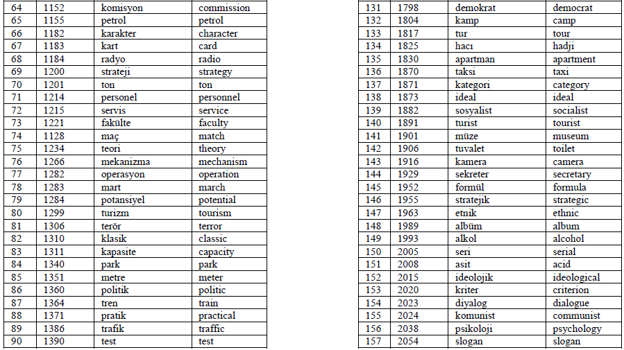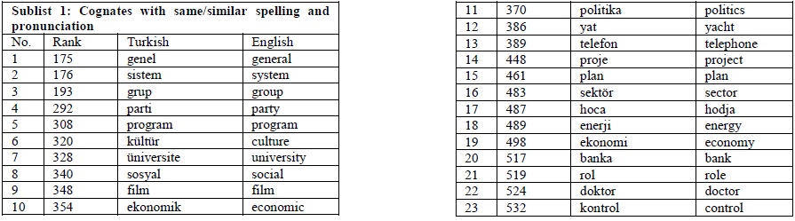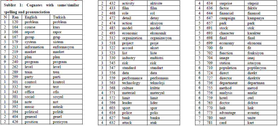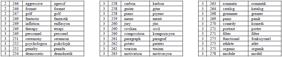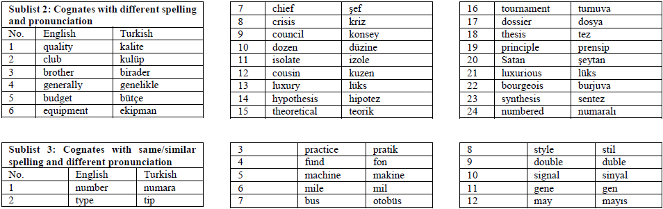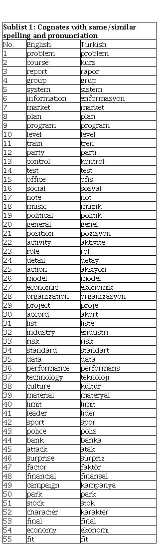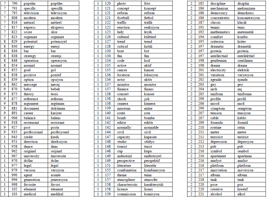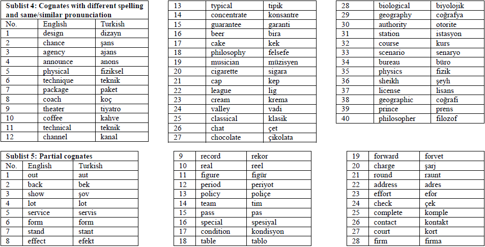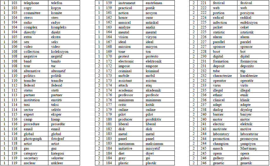 To this end, based on the broad synchronic viewpoint of cognates and due to the loanwordbased characteristics of Turkish-English cognates, the phrase ‘loanword cognates’ is used in the present study. In addition, since the major objective of the current study is to create a word list of loanword cognates that may serve the purpose of language teaching and learning, especially for classroom practitioners and lower-level English learners rather than linguists, cognates and loanword cognates are used interchangeably in the study to avoid redundancy. In short, in the current study, cognates are word pairs that have identical or very similar semantic meaning and orthography between two languages, although the phonological forms of the two words may or may not be the same. For instance, alternative in English and alternatif in Turkish are loanword cognates.