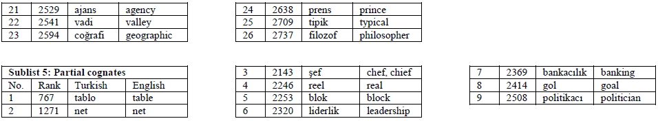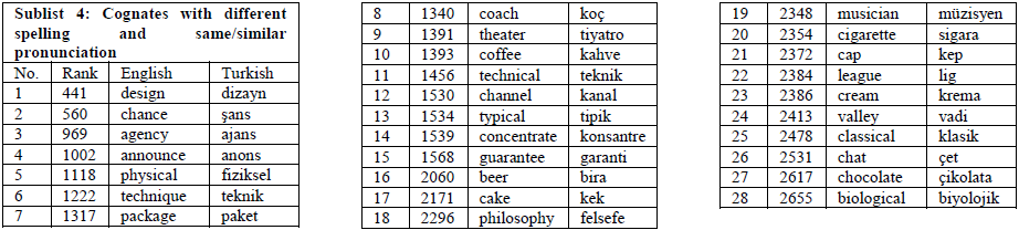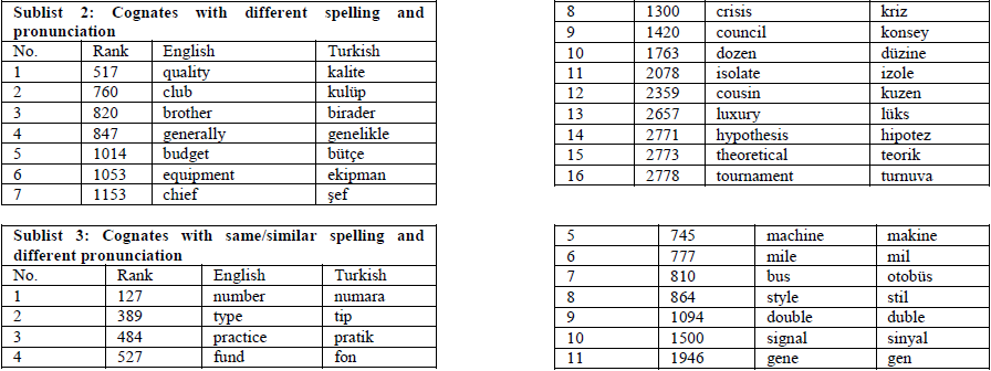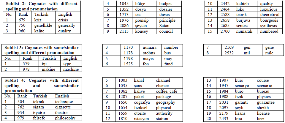 To answer the third research question, combining the identified Turkish-English loanword cognates from the NGSL and the FDT, 582 Turkish-English loanword cognate word pairs were finally compiled to form the Turkish-English Loanword Cognates Word List (TELCWL). For pedagogical purposes, the TELCWL was compiled based on the frequency of the English words and divided into five sublists, including cognates with same/similar spelling and same/similar pronunciation, cognates with different spelling and different pronunciation, cognates with same/similar spelling but different pronunciation, cognates with different spelling but same/similar pronunciation, and partial cognates.
