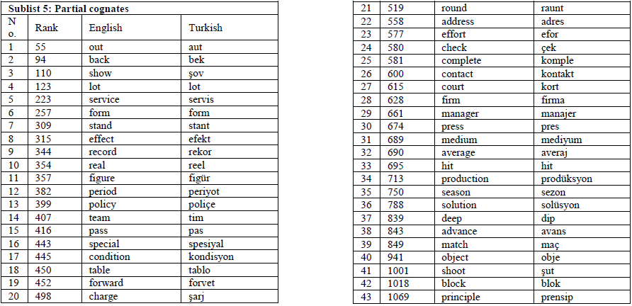 Criterion 3. There are also some loanword cognates in either English or Turkish only sharing one or a few of the multiple meanings that the corresponding word in the other language contains. Additionally, some words in one language can only be used in certain restricted disciplines or professions in the other language. These two types of corresponding English and Turkish words were categorized as partial cognates regardless of their similarities and differences in spelling and pronunciation. For instance, defans (i.e., defense in English) in Turkish is only used in sport-related contexts; solüsyon (i.e., solution in English) is only used as a technical term in certain science disciplines such as chemistry; kombine and kombin (i.e., combine in English) refer only to the combined tickets of sport events and harmony of outfits respectively.