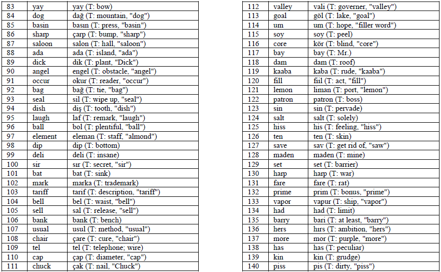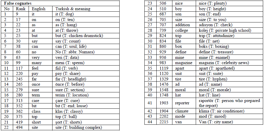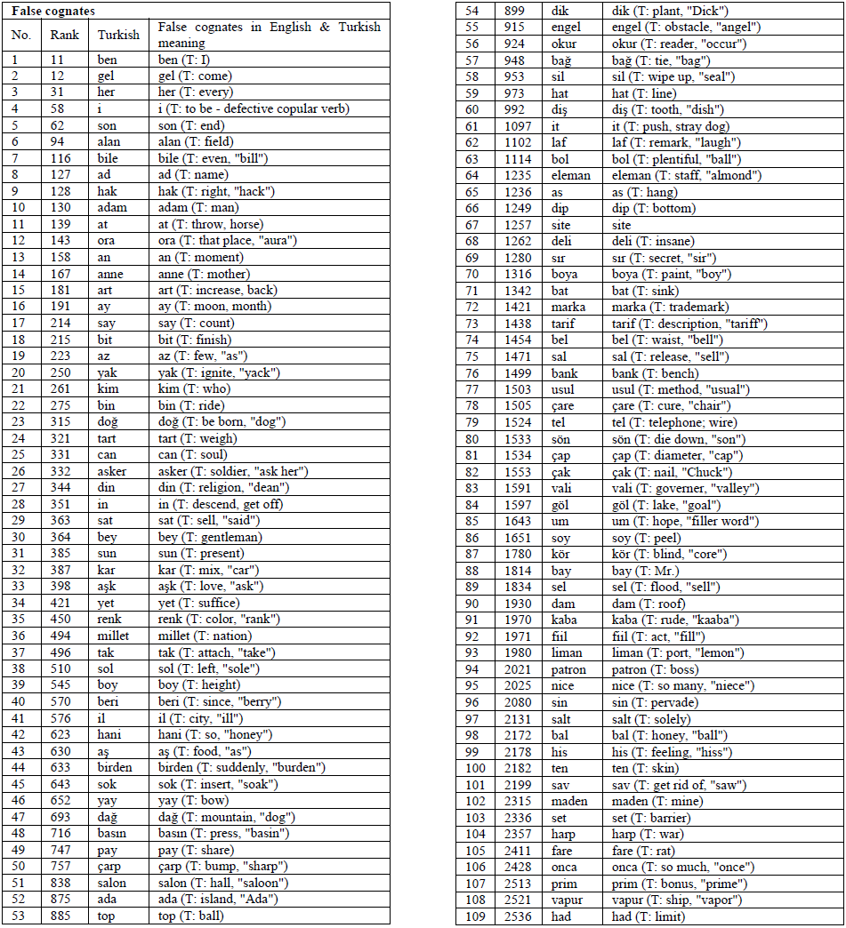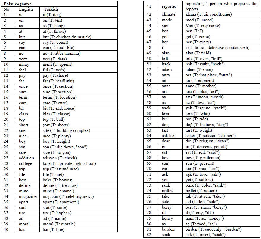 Criterion 5. English and Turkish words that share either recognizable spelling or pronunciation but differ in meaning were categorized as false cognates, e.g., top in Turkish means ball, bin in Turkish means thousand.