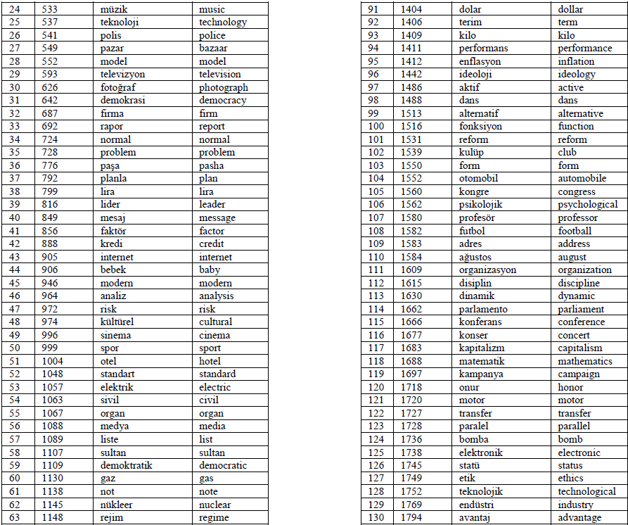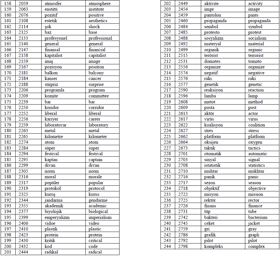 In alignment with the principles used in establishing the NGSL, the Frequency Dictionary of Turkish (FDT) was also developed with the consideration of assisting learners of Turkish as a second or foreign language. The base corpus of the FDT is the 50-million-word Turkish National Corpus (TNC). The TNC was constructed following the BNC to form a balanced and representative corpus of contemporary Turkish (Aksan et al., 2012). Both written and spoken language were involved in the corpus. Thus, the FDT includes the 5000 most frequently used words in contemporary written and spoken Turkish. As the FDT was derived from general written and spoken Turkish under systematic principles and it was created with pedagogical purposes, the current study employed the FDT as the base Turkish word list to identify the English cognates. In order to have a clear comparison with the English word list, the first 2801 words from the FDT were examined.