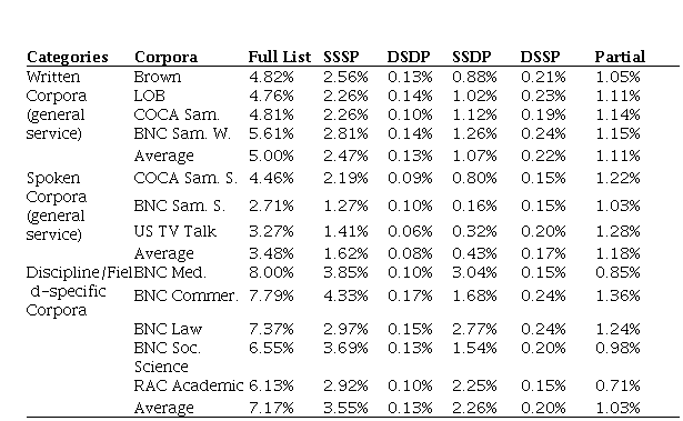 The coverages of the full word list and each sublist of the loanword cognates were investigated except the false cognates list because the main purpose of compiling the false cognates list was to provide a reference list that teachers and students may need to pay special attention to. Besides, the coverage of a false cognates list in a corpus may not have a critical influence on pedagogical practice.