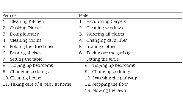 The last category to analyse the coursebook in terms of gender representation is household chores. The activities performed by the female and male characters are given in Table 3. According to Mkuchu (2004), the stereotypical household chores performed by female characters involve tasks such as cooking, cleaning and taking care of children whereas male characters carry activities out of the house; gardening, and mending (as cited in Sivaslıgil, 2006).