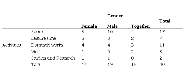“Leisure time activities or free time activities can be defined as activities which are performed in one’s spare time after work/school or at weekends” (Yılmaz, 2012). The activities assigned to men and women might be stereotypical representations such as taking care of children, or performing indoor activities (reading, watching TV, cooking, etc.) for female characters; outdoor activities (playing football, riding bicycle and driving car) for male characters (Yılmaz, 2012). In this study, the gender distribution of the activities was investigated.