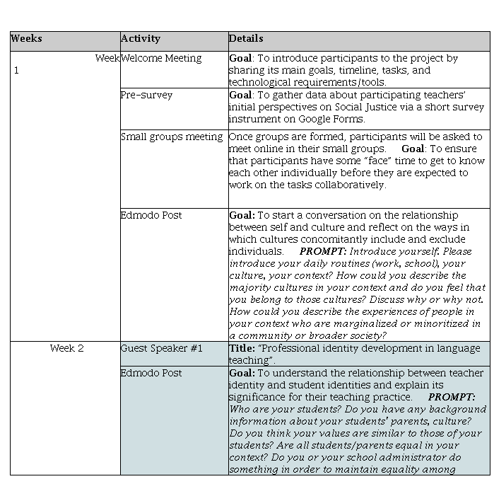 In the STEPS project, we designed and implemented a virtual intercultural exchange (a.k.a. telecollaboration) program for pre-service and in-service teachers to develop their intercultural communicative competence and prepare them to work with culturally and linguistically diverse student populations, especially from refugee backgrounds. Since this project was granted by the Regional English Language Office (RELO) of the US Embassy in Turkey, one of the goals was expected to foster Turkish and US ties and bring the individuals from both countries together in intercultural collaboration projects. Thus, this project involved teachers from Turkey and the USA and engaged them in collaborative intercultural learning through synchronous and asynchronous online participation to promote social justice. The project lasted for six weeks and was based on weekly tasks on the Edmodo platform, a learning management system (www.edmodo.com). While we were designing the project as a research team, we tried to focus on four pillars of social justice - identity, diversity, justice, and action- which were proposed by Learning for Justice group (https://www.learningforjustice.org). For example, in terms of identity, we asked participants to introduce themselves so that they could write and think about their own identities. Next, participants wrote posts about their students and the main goal was to create awareness about the diversity in the classroom. In another task, participants wrote a daily routine from the perspective of a refugee student and they discussed the injustices these students might encounter in their daily life. After the tasks were completed, they were shared with the RELO of the US Embassy. The RELO office also made some suggestions and recommendations and we finalized the tasks at least one month before the project implementation.
