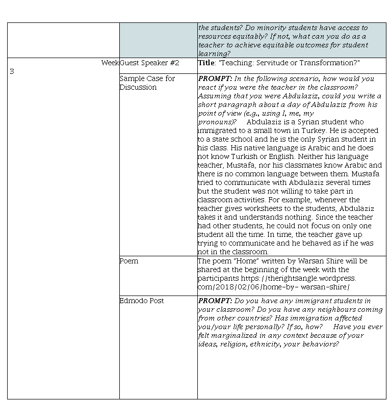 The third and fourth weeks included two scenarios from two different contexts, the US and Turkey. The main objective of the tasks assigned to the participants in these two weeks was to encourage empathy with the marginalized students. Therefore, the participants were asked to write a daily routine from the perspectives of two immigrant students. Although the scenarios were fictitious, they were possible to witness in language classes. The scenarios were as follows: