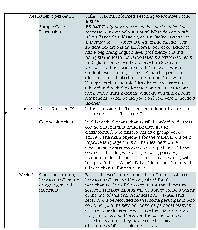 In the literature, the need for including social justice issues in teacher education has been widely discussed (Aronson et al., 2020; Cochran-Smith et al., 2009; Cochran-Smith & Fries, 2005; Milner, 2017; Pugach et al., 2019; Reyes et al., 2021; Zeichner, 2009). For example, Reyes et al. (2021) explained this need as “teacher educators work to prepare teachers for an array of contexts and demographic shifts” (p. 353). Moreover, teacher educators are often unaware of the contexts in which pre-service teachers will work. Milner (2017) also reported that early career and pre-service teachers felt unprepared for social justice work at schools. The importance of training pre-service teachers for their future teaching career is argued by Pugach et al. (2019, p. 206) as the world shifts towards “increasingly global societies facing persistent inequities”. It is quite obvious that there is an increasing need for integrating social justice issues in educational settings; however, it is not an effortless task for teachers. In previous studies, many researchers (Aronson et al., 2020; Ploof & Hochtritt, 2018; Pugach et al., 2019; Reyes et al., 2021) made suggestions on how to foster social justice for pre-service teachers and how to integrate these critical issues in teacher education curriculum. Aronson et al. (2020, p. 35) acknowledged that social justice should be “embedded across all courses within teacher preparation programs” rather than offering a single course aiming to foster social justice. During the implementation, they believed that teacher educators should be willing to reimagine the way they prepare pre-service teachers. Ploof and Hochtritt (2018) also highlighted the importance of introducing pre-service teachers to curriculum that fosters respect for human rights. Pugach et al. (2019) argued that the learning and growth process should start with understanding the identities of the students and suggested that teachers understand how they view and respond to their students regardless of their complexity. Last but not the least, Reyes et al. (2021) recommended co-teaching and collaboration, which they argued as one of the missing points in higher education. They stated that if we could build connections among the teacher educators, we could “better prepare to engage with our students in meaningful and transformative ways” (p. 363). This collective view of teaching and learning for teacher education was touched upon by Villegas and Lucas (2002). Aronson et al. (2020) worked on the curriculum in collaboration, and they stated that their study yielded positive results in terms of students’ social growth. These kinds of collaboration studies help teacher educators to critically examine the curriculum and revise it for diversity. In light of these studies, we also attempted to bring teachers and pre- service teachers from different contexts in an online platform and we expected the participants to critically examine their educational settings.