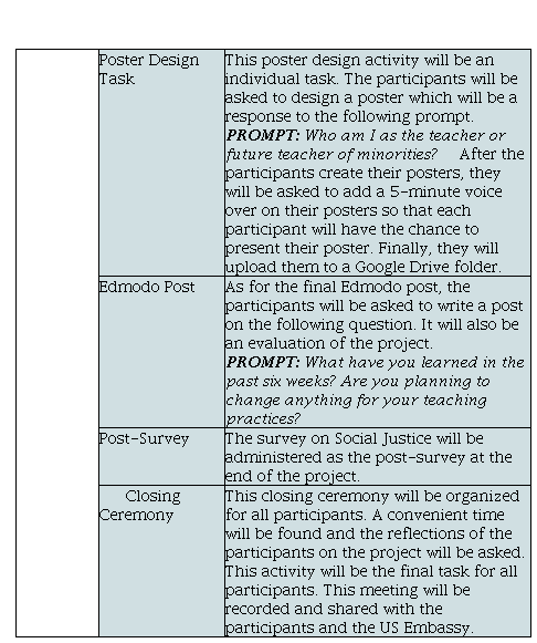 As for the fifth week, the participants were asked to work collaboratively in their small groups (n=7-8) to design course material that could be used in their current or future classrooms. The main objective of the material was to improve the language skills of their learners while creating awareness about social justice. Finally, in the sixth week, they all designed posters individually, answering the question: “Who am I as the teacher or future teacher of minorities?”; and wrote reflection posts on what they learned at the end of the project.
