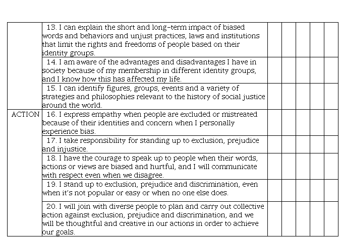 In the literature, Nieto (2010) stated that teachers should examine their thoughts and attitudes towards others; and in this study, we found that the participants acknowledged that they evaluated themselves, and the project created an awareness for social justice issues. This issue is also related to the standards of the Learning for Justice research group. One of the social justice standards was identity, and we found the participants could find an opportunity to reflect on their attitudes and opinions on social justice. The most important component of the social justice standards and Nieto’s (2010) guidelines was taking action against discrimination, inequalities, prejudices, and stereotypes. Knowing the differences, being aware of the inequalities, and being kind to people are not enough for individuals (Nieto, 2010). Individuals are expected to take action for maintaining social justice. In this study, a theme related to this point emerged - promise for taking action. The participants stated that they would be more sensitive to social justice issues in their classrooms and future classrooms, which was the main goal of this project.