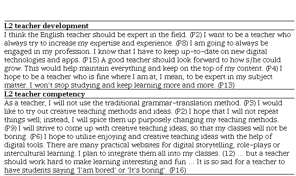 In this type of future-oriented identity work, the focus was also on ‘L2 teacher competency’. In particular, participants’ possible selves were focused to a great extent on becoming an active and competent user of innovative and creative teaching methods. Besides, participants’ hoped-for selves related to L2 teacher competency involved the references to instructional strategies including individual learning support, differentiated instruction, variety in the classroom, using sufficient and authentic tasks, creating alternative scenarios and designing and implementing different materials in the classroom.