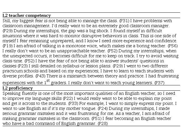 Participants also reported their L2 proficiency-based feared selves, which revealed their need to have stronger linguistic knowledge and better confidence in speaking. These participants recognized as their weaknesses the inability to use English language like a native speaker. Feared possible selves mostly focused on making grammar mistakes and stuttering while speaking since they seemed to believe their students would be judgmental and critical of their language skills.
