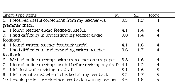 The self-developed survey was composed of 10 Likert type questions asking the students’ perceptions of teacher e-feedback and one open-ended item to give participants the floor to express their feelings, if they have any, regarding the same practice. The questionnaire items were prepared by the researcher, and then feedback was received from two instructors offering the course. Some of the questions were refined based on the instructors’ views. The final version of the questionnaire was administered to the participants on Google forms.