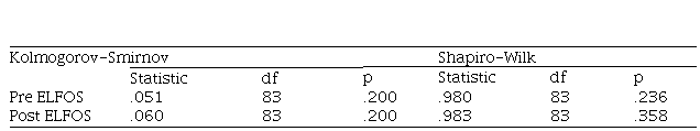 When the distributions of the pre and post ELSOS scores were checked with the Kolmogorov- Smirnov and Shapiro-Wilk tests of normality, normal distribution was found at both measures under investigation (p>.05). Therefore, the data were available for the use of parametric tests. The results of the normality tests are displayed in Table 2.