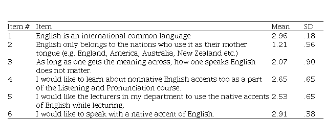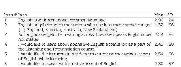 This fourth item was incorporated into the questionnaire in order to collect data about the participants’ reactions towards the inclusion of nonnative English varieties in English lessons. This item was worded by targeting a particular course; that is the Listening and Pronunciation course because of two reasons: it seemed to be the most relevant course for the inclusion of nonnative English varieties, and also the researcher was offering this course at the time of data collection.