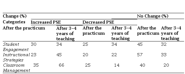 A quick look at the tabulated results shows a clear and remarkable dominance of increases in the ratings of the participants of their PSE beliefs after the actual teaching experience. Decreases, on the other hand, seem to be more prevalent in the sub-category of Efficacy in Student Engagement, which might be interpreted as a mismatch between expected PSE before any teaching experience and after three or four years of teaching experience.