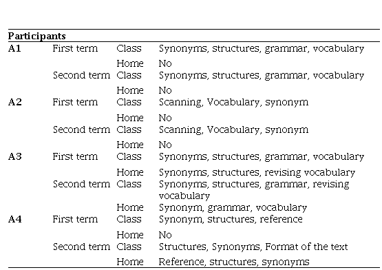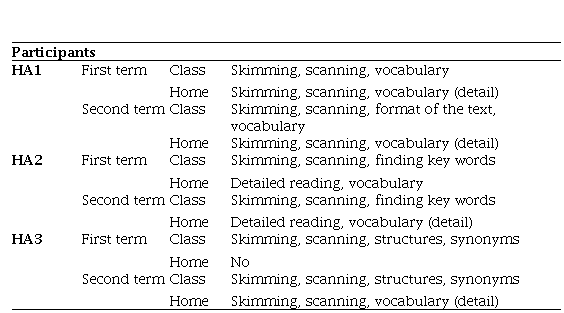 These participants also had the think-aloud protocols both in the first (fall) term and the second (spring) term so as to determine what they were doing in the reading. By doing so, the researcher had the chance to observe what kind of strategies they were using at the first hand. After each think-aloud process was over, the researcher asked them what they would do if they were given that reading text at home as an assignment. Table 2 shows what they did in the think aloud protocols prepared by the researcher and what they would do with the same reading task if they were given at home.