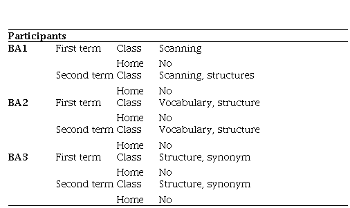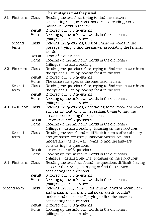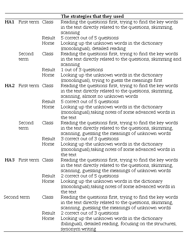 Another important point that should be taken into account was that they all did not do any reading exercises at home both in the first (fall) term and second (spring) term so as to be able to use strategies.