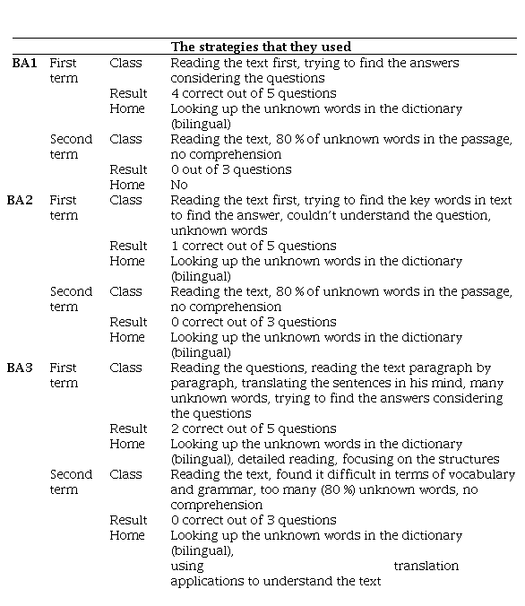 When they were asked about what they would do if that text was given to them as homework, all of them said they would look up the unknown words in the dictionaries that would give the Turkish equivalences of the words that they did not know. They did not change this strategy and they said the same thing in the second think aloud sessions as well.