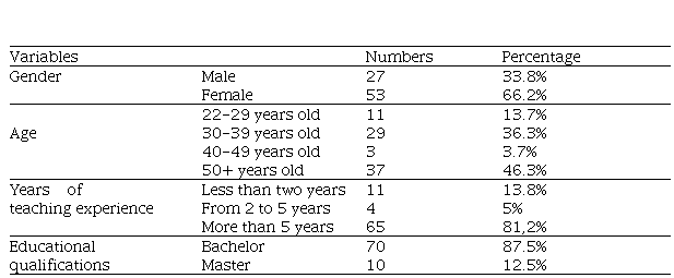 A total number of 80 EFL teachers working in different high schools in a province in the south of Vietnam responded to the questionnaire. Table 1 presents Information with the participants’ genders, age range, teaching experience, and educational qualifications.