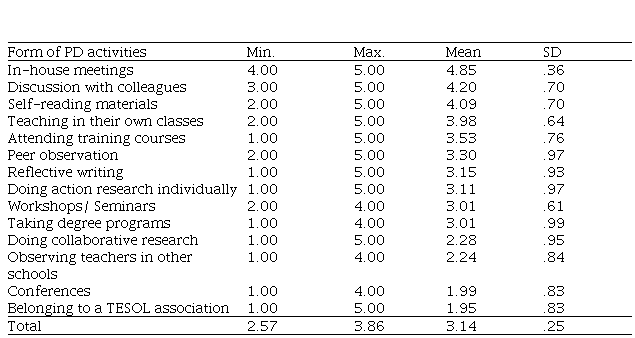 In exploring the teachers’ perceptions of PD activities, the study first investigated what opportunities for PD the teacher participants have been able to gain access to in this context. Table 2 displays the results of the Descriptive Statistics test.