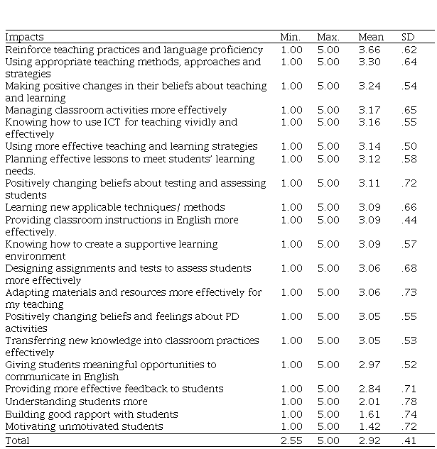 As explained earlier, the second key focus of the present study was drawn towards the teachers’ perceptions of the impacts of the existing PD activities they have gained access to exerted on them and their teaching practice. A Descriptive Statistic test was run to check the influential level of the existing PD activities on the participants’ teaching and learning.