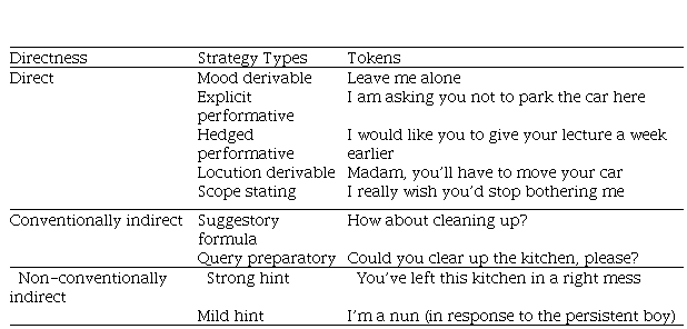 The current study investigates teaching pragmatics within the scope of speech acts, and specifically, it will focus on the speech act of requests. The theory of speech acts goes back to the 1960s when J.L. Austin published How to Do Things with Words. According to Austin (1962), when people utter something, they do not do it for the sake of describing, rather utterances make them achieve communicative goals. Additionally, Yule (1996) states that when people utter something, they have an intention and a force behind their words, which might influence the hearers' behaviors. The relevant literature examines speech acts in three categories: locutionary, illocutionary, and perlocutionary acts. Locutionary acts refer to the utterances performed through the correct use of vocabulary and grammar, illocutionary acts refer to the intention and force behind the utterance, and perlocutionary acts refer to the effect that the utterance has on the interlocutor. Among these three categories, illocutionary acts are associated with speech acts more when pragmatics are framed into second language instruction. Searle (1975) identified five types of illocutionary forces: declarative, assertive, expressive, directive, and commissive forces. Speech act of requests is categorized under directive forces since the directive force of an utterance refers to the speaker’s intention to get the interlocutor to do something, and the utterance with a directive force is shaped based on the context and the power relations between speakers. It is stated in the literature that there are a variety of strategies employed by speakers to perform speech act of requests. Table 1 below displays the request strategies proposed by Blum-Kulka and Olshtain (1984) as the result of the Cross-Cultural Speech Act Realization Project (CCSARP) that was created in reference to eight languages and varieties.