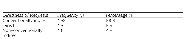 The qualitative data quantified from DCT have shown that conventionally indirect requests are frequently used by Turkish EFL learners. The total number of requests can be seen in Table 3 below.