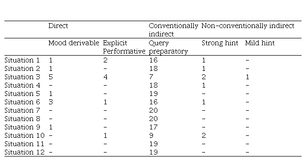 Regardless of the situation varying in the rank of imposition, power, and distance, learners use "could, can, would you mind, do you mind if..." structures while making requests. Conventionally indirect requests are followed by direct requests and non-conventionally indirect requests. However, they constitute a small part of the percentage. Apart from examining the directness of requests, directness strategies have been investigated. Table 4 below displays the number of strategies that were used in each situation.